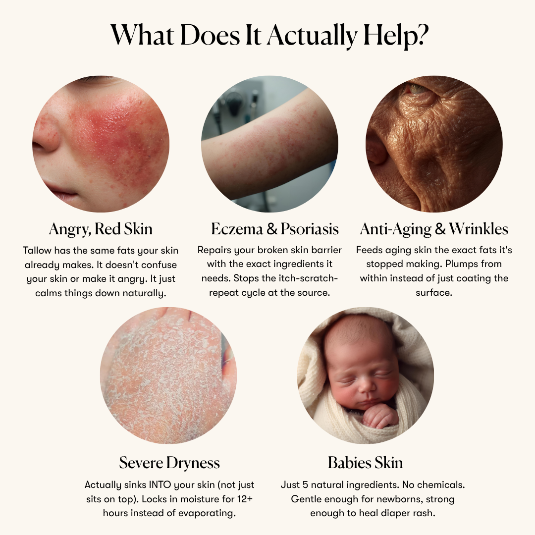 Store creams use synthetic molecules your skin doesn't recognise. Tallow? Your skin treats it like it's your own sebum. That's why it works when nothing else does.